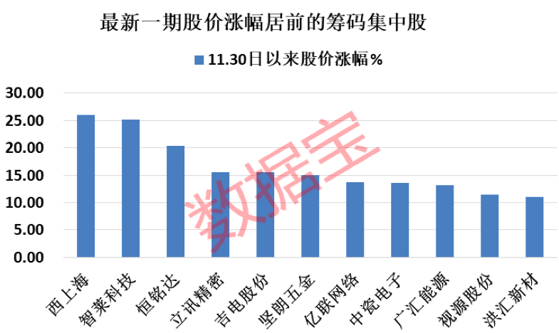 数据宝统计,最新一期筹码集中股11月30日以来股价涨幅超10%的有11股,涨幅居前的有西上海、智莱科技、恒铭达、立讯精密等,西上海的股价涨幅居首,累计上涨26.01%。
