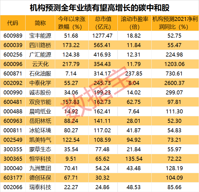 从全年业绩预期来看,机构预测17股的2021年业绩有望增长超50%,其中中泰化学、云天化、石化油服、诚志股份、广汇能源等8股的全年业绩有望实现翻倍增长。