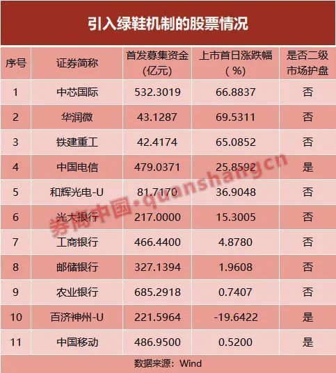 放眼A股历史,引入绿鞋机制的先例并不多。据券商中国记者不完全统计,沪深市场一共有11家企业引入过绿鞋机制。这些企业包括农业银行、工商银行、邮储银行、中国电信、光大银行、百济神州-U、华润微、铁建重工、和辉光电-U以及中芯国际、中国移动。