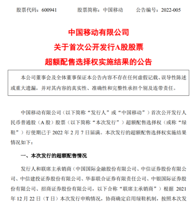 中国移动和联席主承销商根据本次发行申购情况,协商确定启用绿鞋机制,按照本次发行价格57.58元/股,向网上投资者超额配售12685.5万股股票,约占初始发行股份数量的15%。超额配售的股票通过向本次发行的战略投资者延期交付的方式获得。