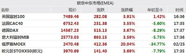 欧洲股市方面,英国富时100收涨3.91%报7489.46点;法国巴黎股市CAC40指数收涨3.55%报6752.43点;德国法兰克福股市DAX指数收涨3.67%报14567.23点。