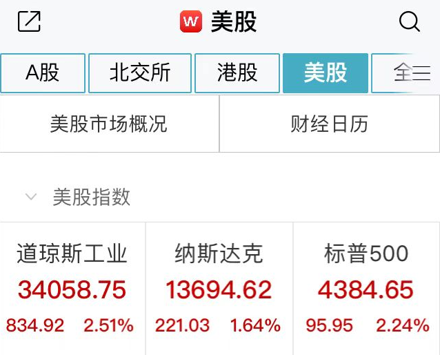 标普500指数收涨95.95点,涨幅2.24%,报4384.65点。道琼斯工业平均指数收涨834.92点,涨幅2.51%,报34058.75点。纳斯达克综合指数收涨221.04点,涨幅1.64%,报13694.62点。本周,道指跌0.06%,标普500指数涨0.82%,纳指涨1.08%。