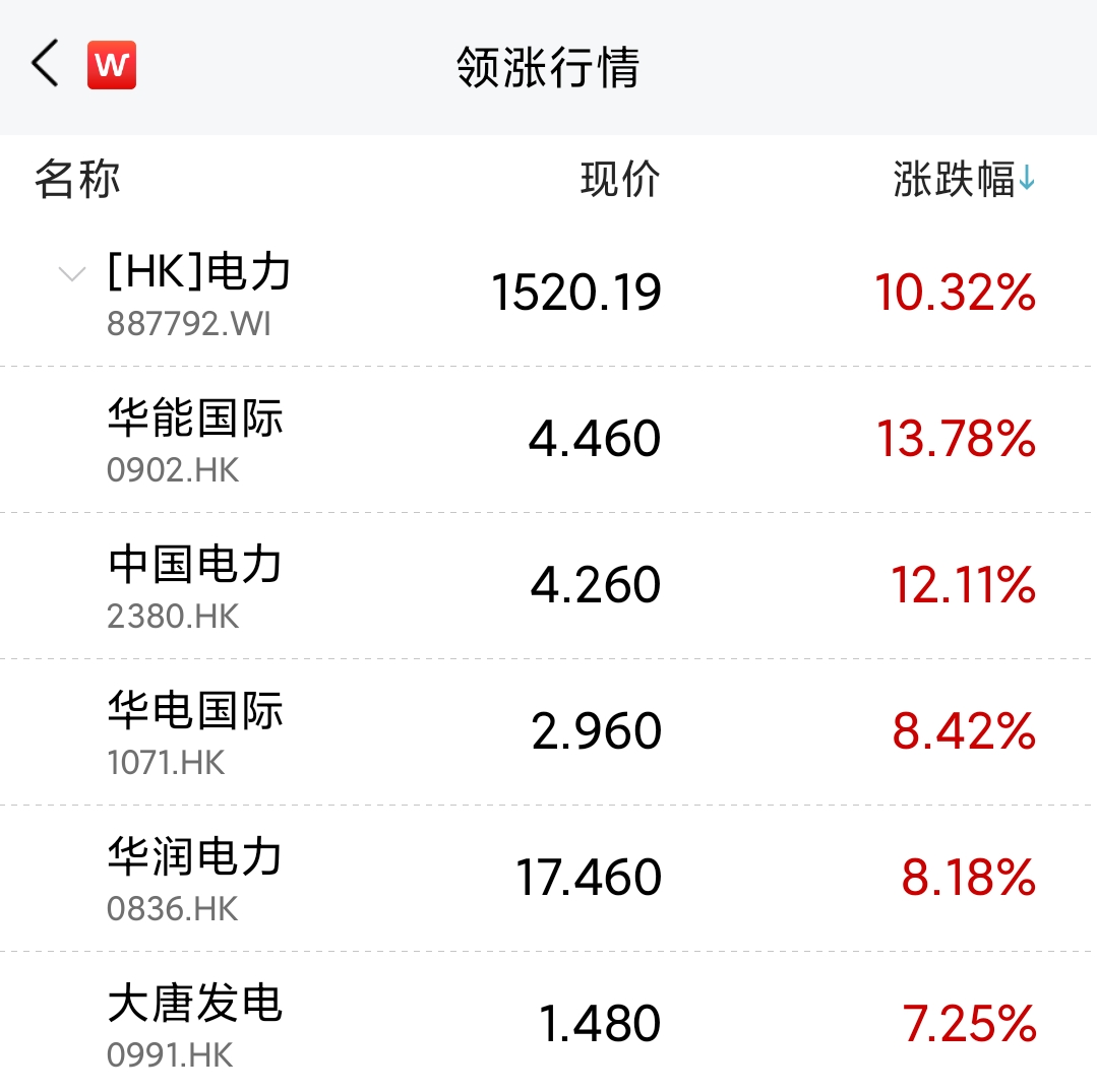 概念板块方面,电力股爆发,华能国际电力涨13.78%,中国电力涨超12%,华电国际、华润电力、大唐发电均录得大幅上涨。