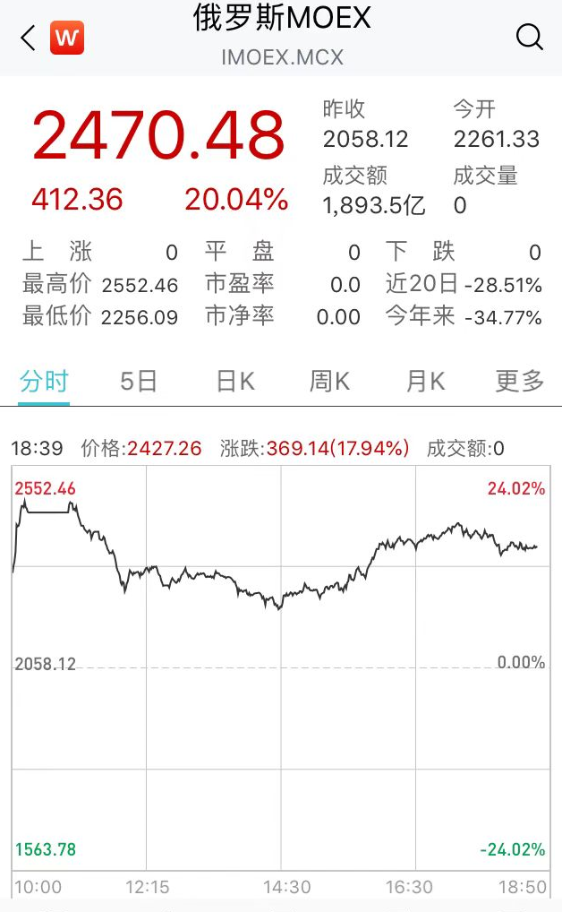 2月25日,俄罗斯MOEX指数创纪录最大日内涨幅,再一次见证历史。