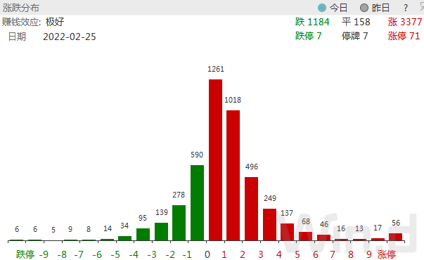 市场谨慎情绪依旧。2月25日,A股上涨家数超过3300家,同时下跌家数亦超过1100家,此外,从涨跌区间分布来看,涨幅在1%以内的有1261家,涨幅在1%-2%之间的亦有1018家,在昨日大跌的背景下,今日反弹成色或显不足