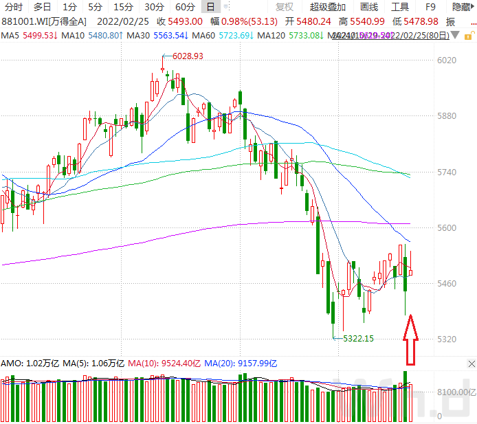2月25日,万得全A指数全天高开高走小幅收涨,成交额为1.02万亿,再度站上万亿关口,虽然较昨日萎缩逾3000千亿,但仍保持较高活跃度。因受地缘局势影响,近期市场波动加大,成交量也随之放大