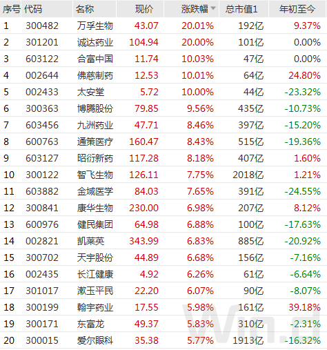 从医药生物板块内个股表现看,万孚生物、诚达药业、合富中国、佛慈制药、太安堂等多股涨停,博腾股份、九洲药业、通策医疗、昭衍新药、智飞生物、金域医学、康华生物、健民集团、凯莱英等个股亦涨幅居前。