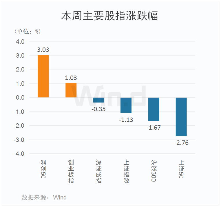 从本周主要股指表现来看,涨跌互现。其中科创50涨幅超过3%,创业板指涨幅超过1%,而上证50则下跌2.76%,沪深300和上证指数跌幅同样超过1%。与前一周相比,板块之间出现分化,同时市场波动也加剧