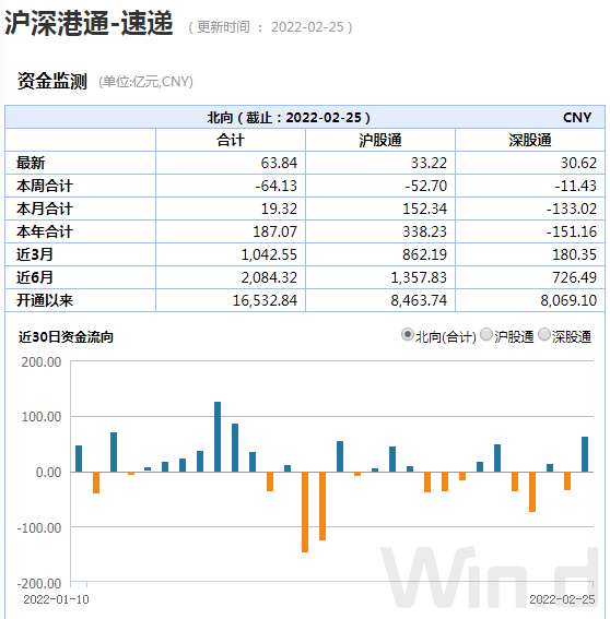 2月25日,北上资金净买入63.84亿元,本周累计净卖出64.13亿元,本月净买入19.32亿元。从本周北上资金动向来看,地缘局势变化影响市场风险偏好,同时也直接影响了北上资金的走向。
