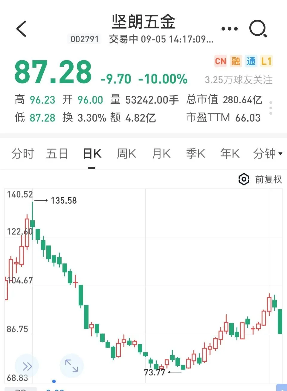 9月5日,坚朗五金股价快速走弱,截止发稿前,坚朗五金股价报87.28元,下跌10.00%。