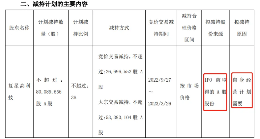 此次复星高科技计划通过集中竞价及大宗交易方式减持不超过总股本3%的A股,按截至2022年9月2日复星医药总股本计,即不超过8009万股,减持价格根据市场价格确定。如果以9月2日的收盘价计,减持可套现约32亿元。此次减持股份来源均为IPO前取得,减持原因复星高科技一笔带过,称系“自身经营计划需要”。