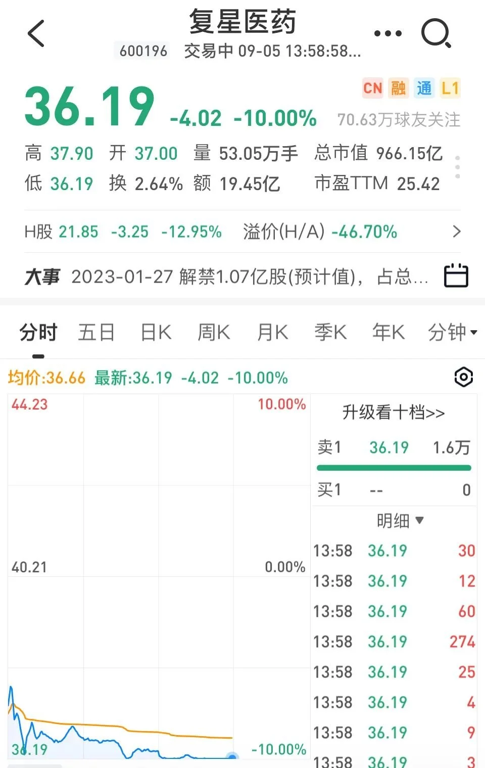 今日开盘,复星医药直线下跌,截止发稿前,股价暴跌10%,成交额19.45亿元。