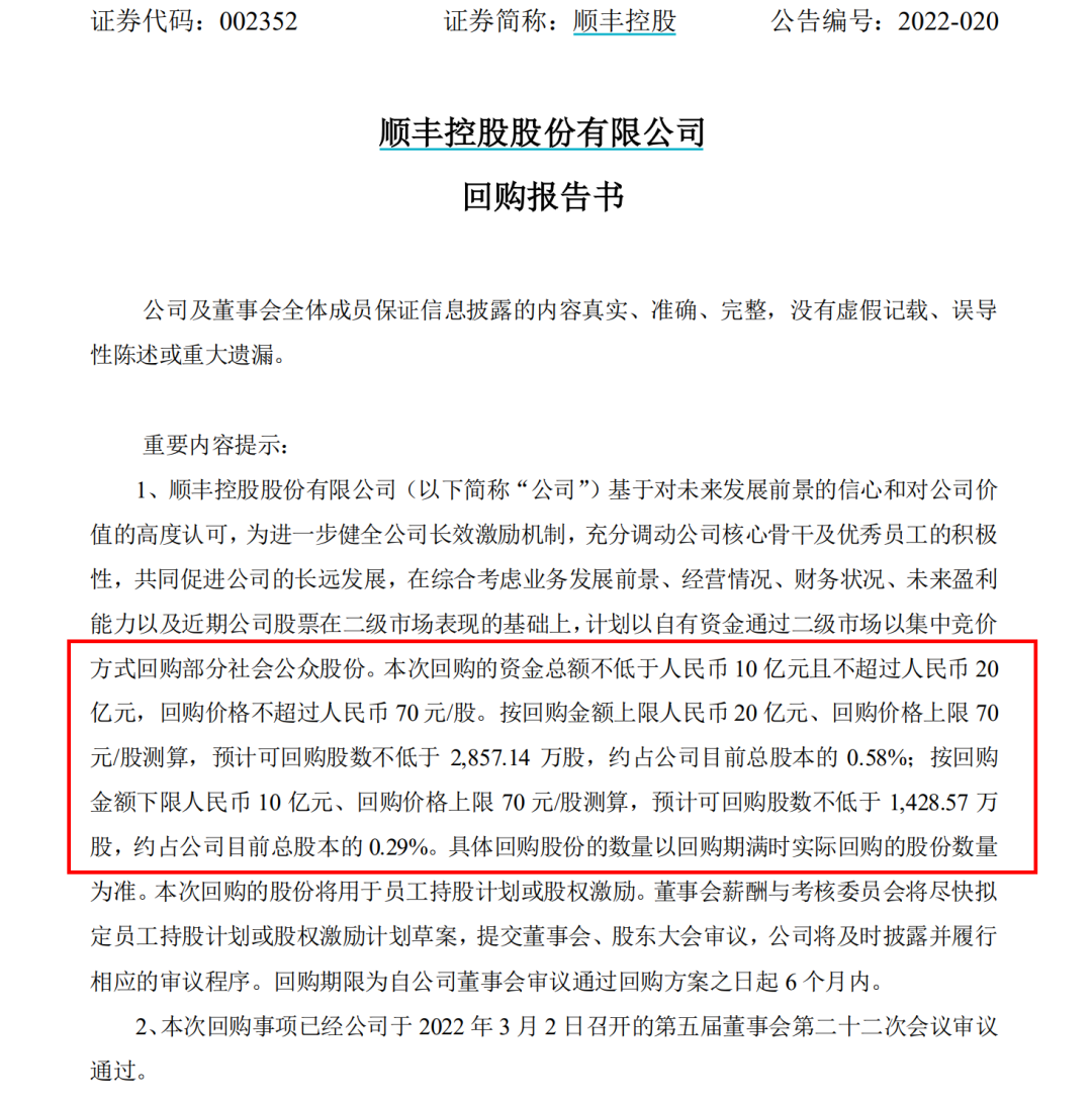 3月2日晚, 顺丰控股 发布公告,基于对未来发展前景的信心和对公司价值的高度认可,公司计划以自有资金通过二级市场以集中竞价方式回购部分社会公众股份。
