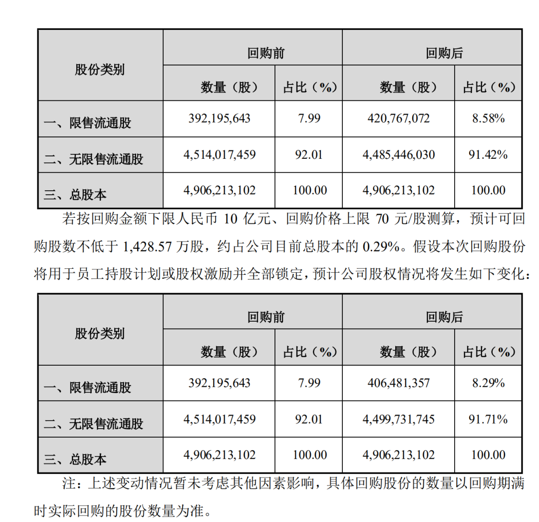 回购的资金总额不低于10亿元且不超过20亿元,回购价格不超过70元/股。此次回购的股份将用于员工持股计划或股权激励。